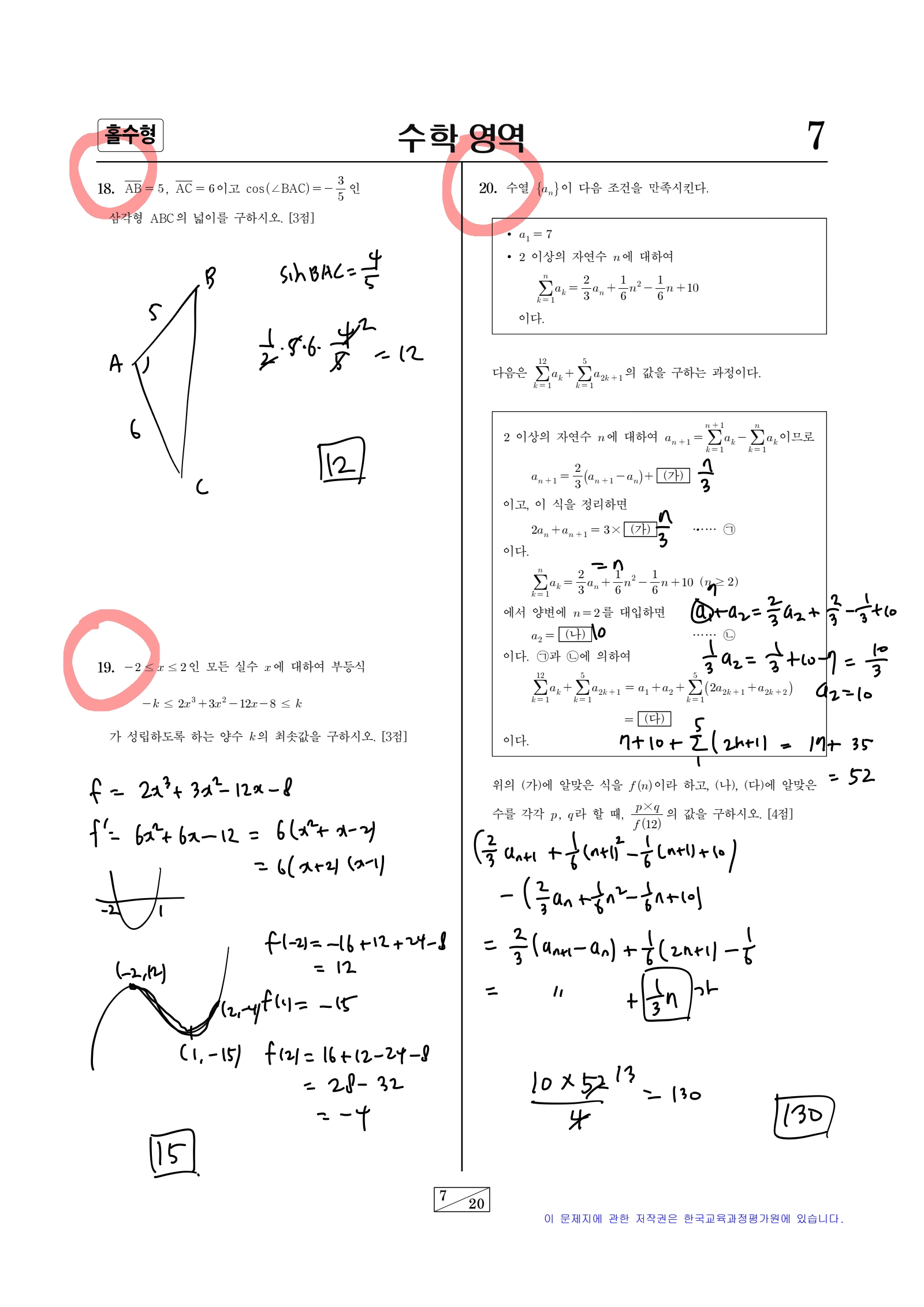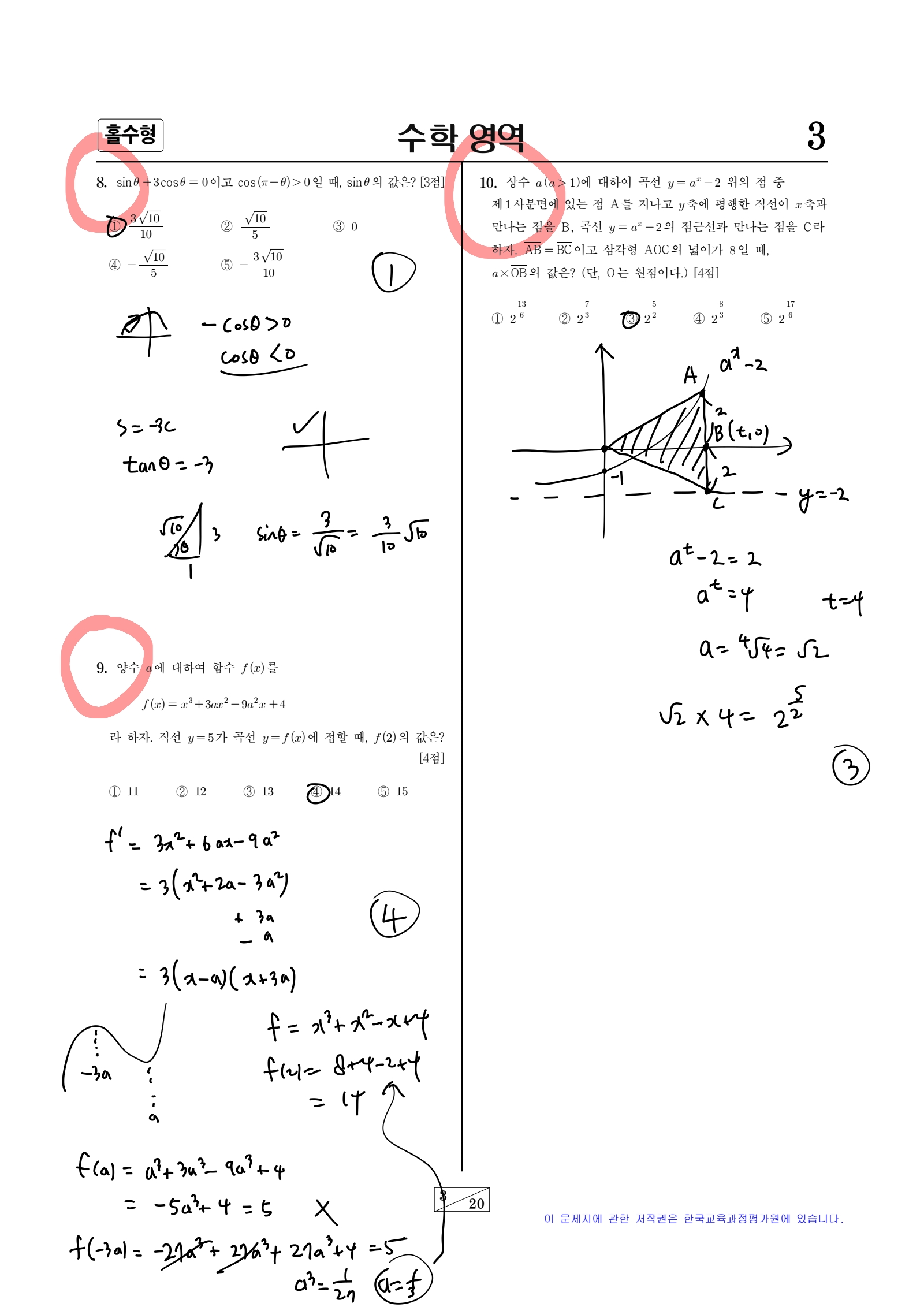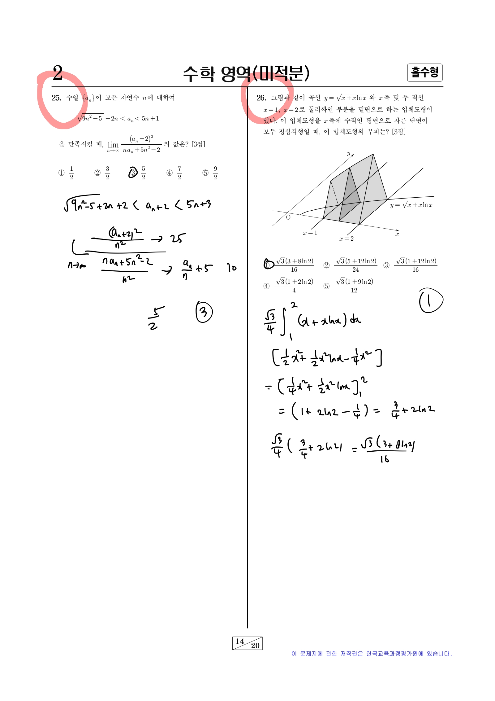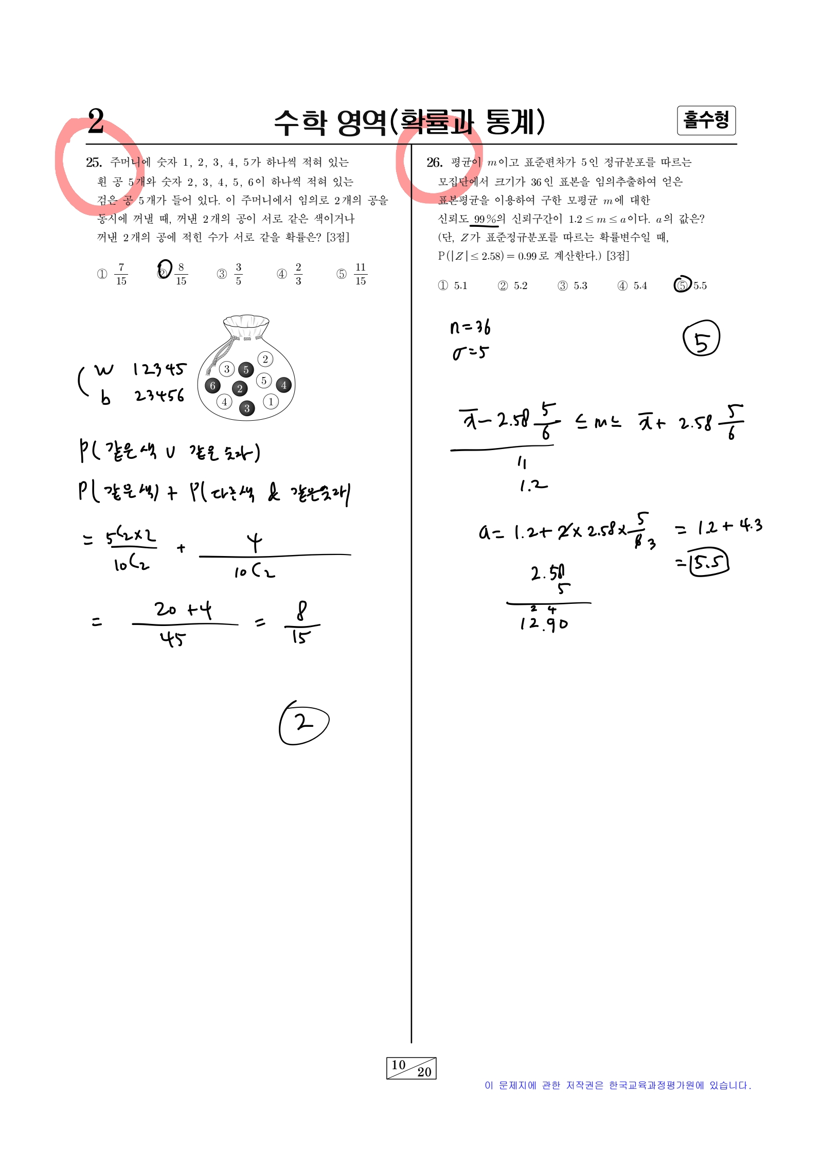 미적분, 확통까지 합쳐서 대충 2시간 반정도 푼 것 같고, 2문제 틀렸다.
