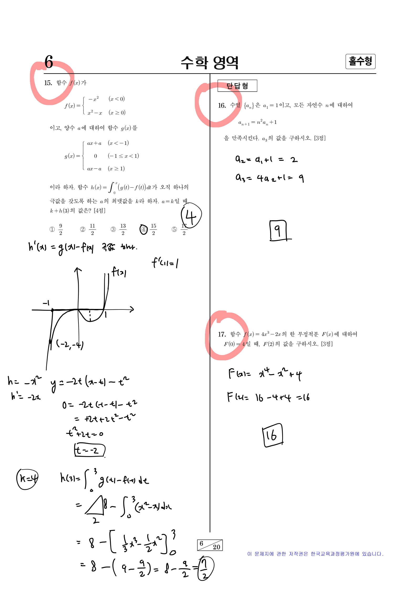 13번 : 별로 어렵진 않은 문제인데, y축으로 둘러싸인 넓이 구해야 하는데 x축으로 둘러싸인 넓이 구해놓고 왜 답이 없냐면서 한참 고민했다... ㅋㅋㅋㅋㅋㅋㅋㅋㅋ