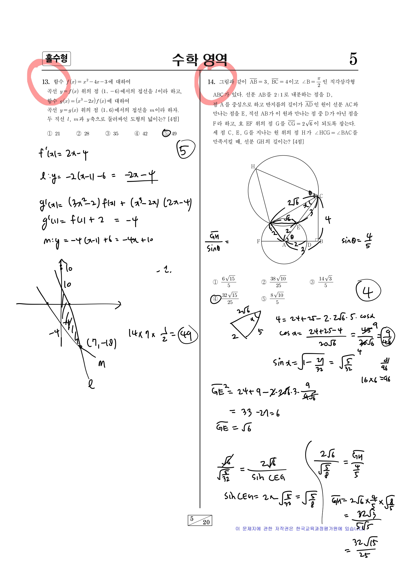 14번 : 드디어 어려운 문제. 삼각형 ABC가 5:4:3 직각삼각형이라 sin(BAC)를 알 수 있다. 이걸 이용해서 sin(CEG)를 구하기까지 식을 이어나가면 된다. 도형을 만지작거리다보면 중간에 턱 막힐텐데, AG에 선을 긋고 삼각형 ACG를 살펴보게 되면 푸는 길이 보인다.