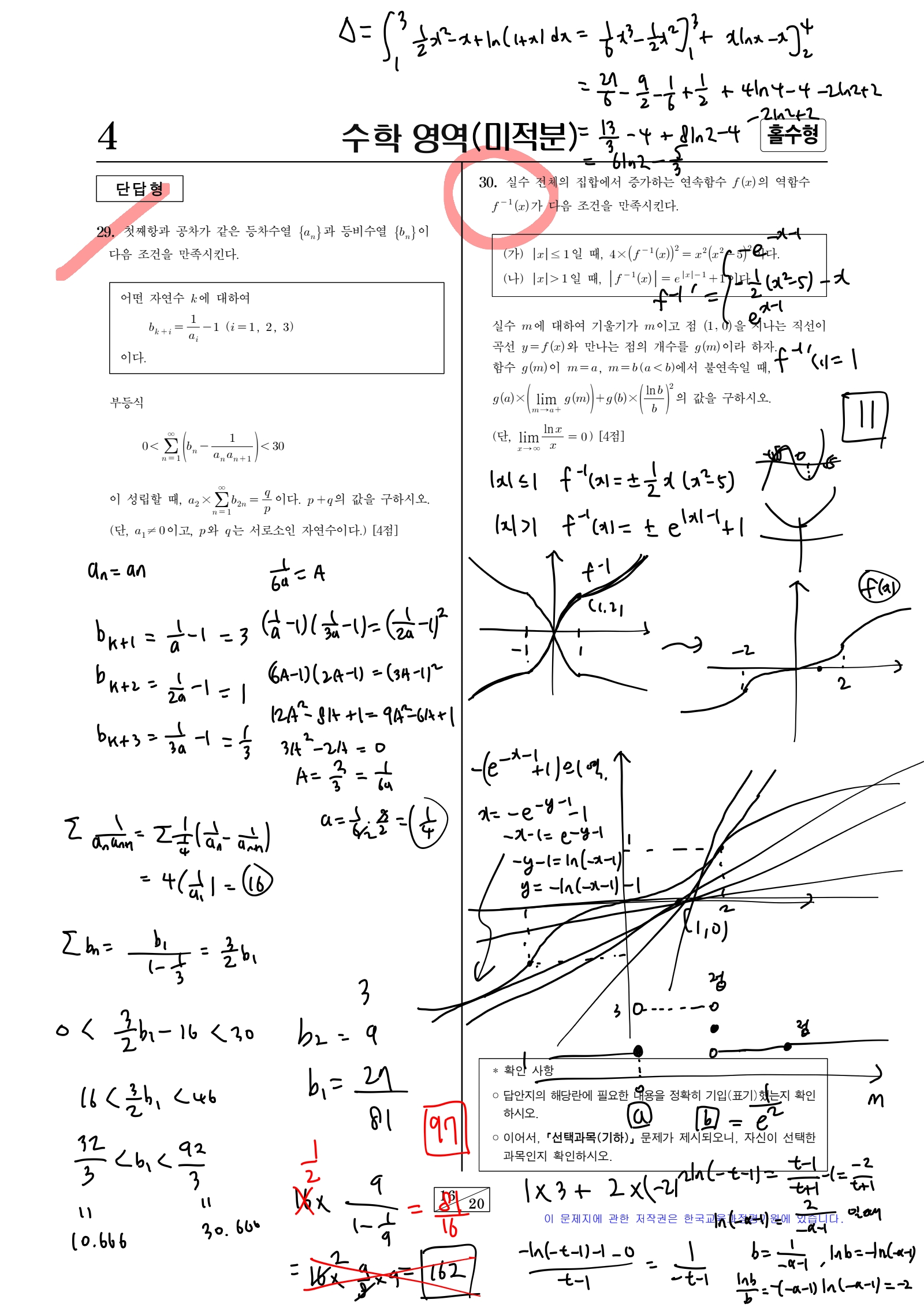 28번 : 어렵게 생겼는데 그냥 역함수 적분하는 문제. 인테그랄 g(t)dt에서 그냥 t를 s로 치환해버리면 해결. 위아래끝도 구하기 어렵지 않게 줬다. 근데 적분 계산이 정말 귀찮게 나와서 계산하는데 애를 좀 먹었다. 이런게 현역 때랑 지금 풀 때랑 차이점이다. 현역이었으면 순식간에 계산 다 했을 듯.