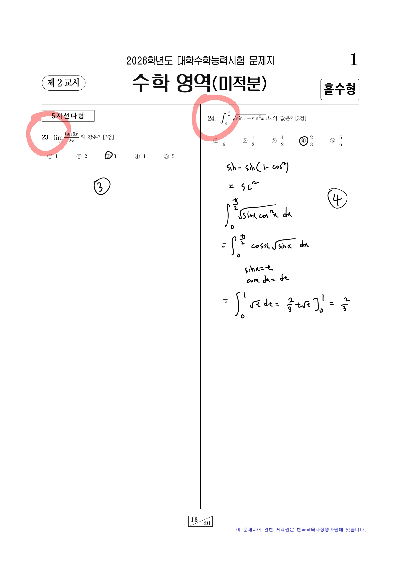 24번 : 오랜만에 보는 치환적분! 최근 미적분을 가르칠 일이 없다보니 아주 반가운 문제였다..