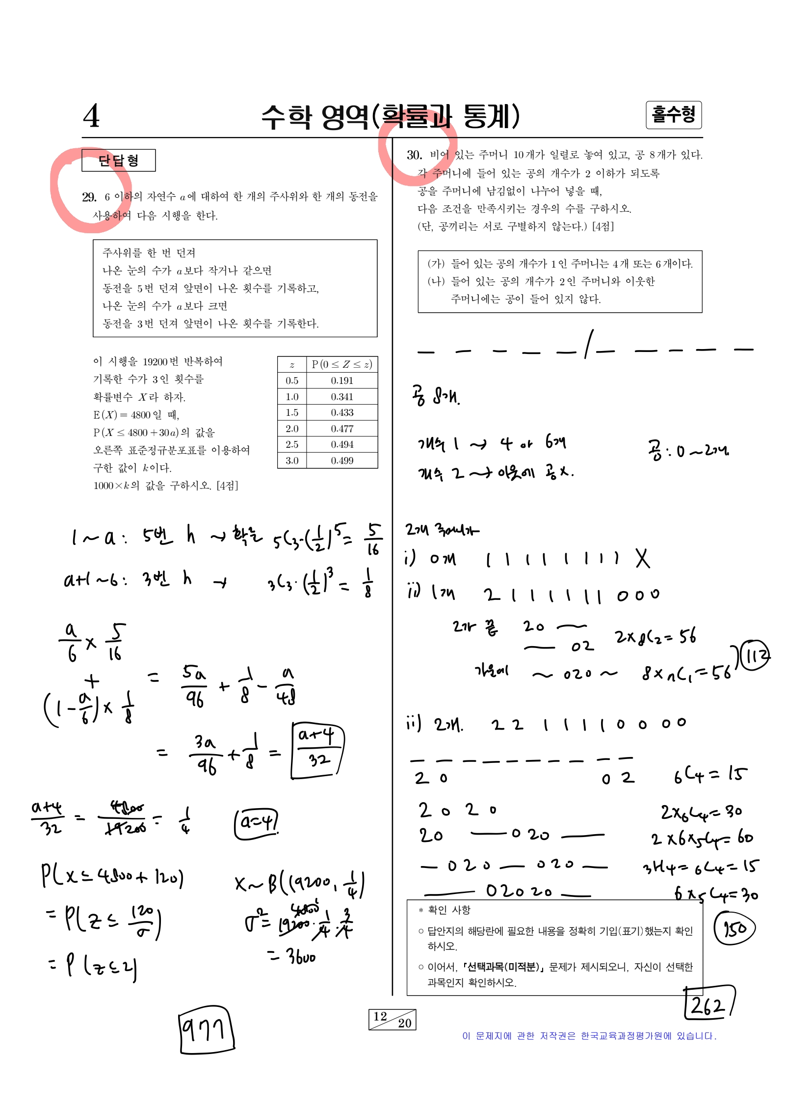 28번 : 확통 객관식 마지막인 조건부확률 문제인데 생각보다 어려워서 놀랐다. 분모 구하는건 쉬운데.. 분자 구하는게 생각보다 머리를 좀 써야한다. (모든 공의 개수의 합이 홀수) and (상자3에 들어있는 공이 상자2에 들어있는 공보다 1개 많음) 경우의 수를 구해야 하니까. 아마 분모를 구할때 홀홀홀짝 / 홀짝짝짝으로 구했을 거라 이 분류를 따라갔을 텐데, 은근 머리아프다.